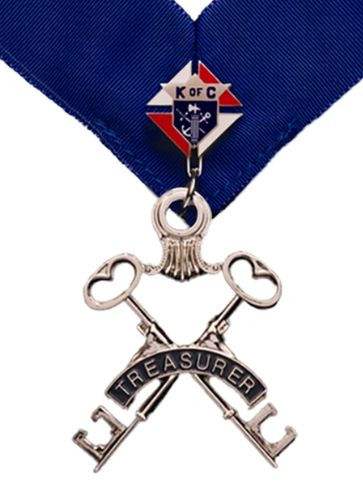 In the Knights of Columbus, the Treasurer is an elected officer responsible for managing and safeguarding the council's funds, including receiving money, depositing it, paying expenses, and maintaining accurate financial records.
